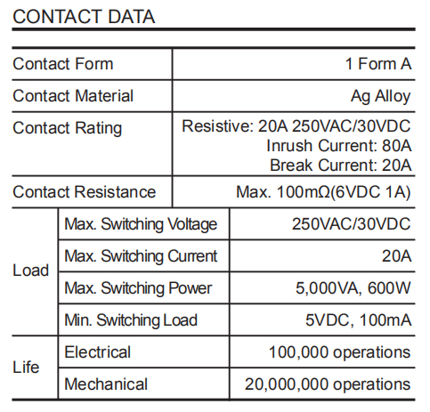 • Miniature relay with high switching contact capacity, 20A/250VAC